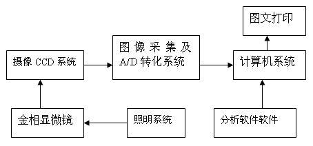 系統(tǒng)組成:1、金相顯微鏡 2、適配鏡 3、攝像器(CCD) 4、A/D(圖像采集) 5、計(jì)算機(jī)